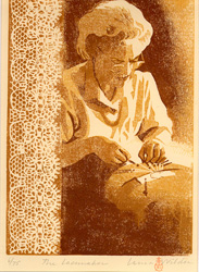 sentimental colored pastel of the Old Lacemaker. This charming 21" x 14 1/2" poster depicts an East Midlands lacemaker working Bedfordshire lace on an old style bolster pillow and pillow horse. |